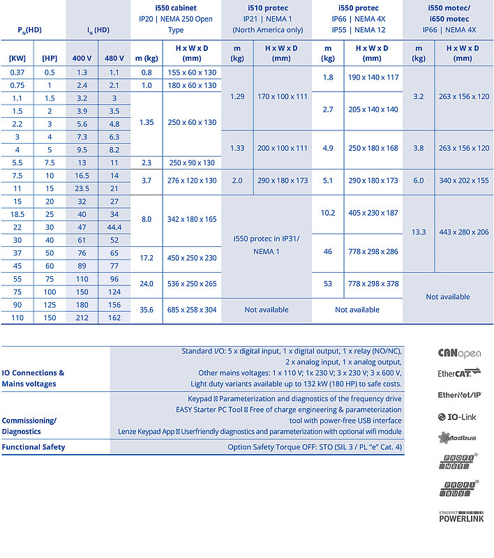 - Dynamic braking: with integrated brake chopper or eco-friendly and easy to use power regeneration into the grid with i550 motec